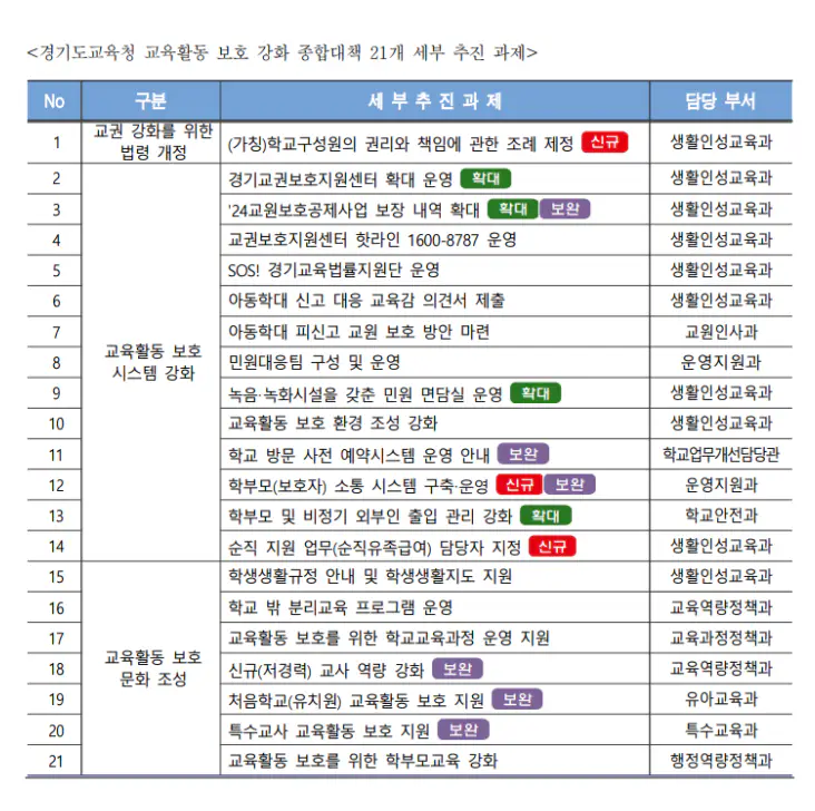 추가로, 경기도교육청은 14개 부서로 구성된 '교육활동 보호 추진단'을 운영하여 관련 정책을 공유하고 협업하고 있습니다.