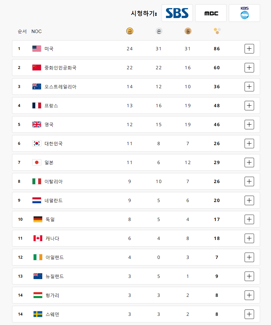 2024년 7월 26일에 개막식과 함께 시작하여 많은 종목들이 진행되었고 대한민국은 현재 매달순위 6위에 올랐습니다.